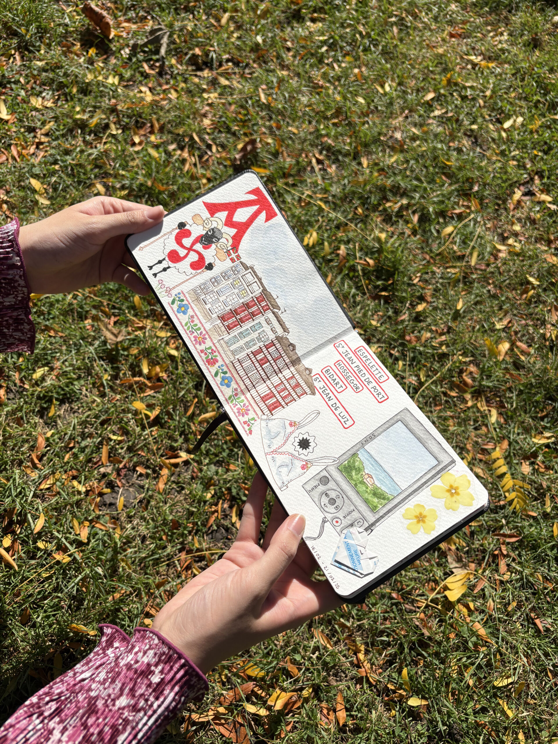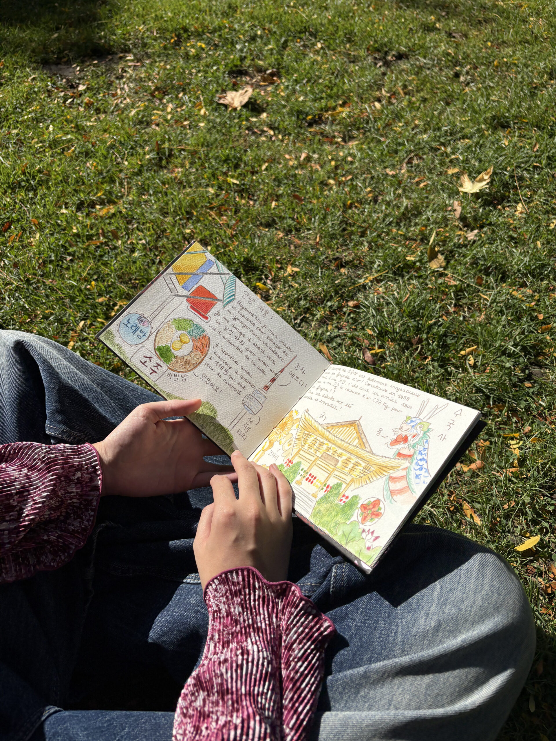 À la suite d’un workshop consacré au carnet de voyage en 2024, j’ai commencé à retranscrire mes propres voyages. Le premier carnet représente un voyage fictif en Corée du Sud. Les dessins sont réalisés aux crayons de couleur ainsi qu’à l’aquarelle, ce qui rappelle le côté fait main et unique du carnet de voyage. Le second est mon carnet de voyage personnel, que je tiens depuis la fin de 2024 et dans lequel j’entretiens et améliore mes capacités en dessin. J’essaie de dessiner spontanément à l’intérieur tout en créant un équilibre entre les différents éléments. J’aime beaucoup utiliser l’aquarelle car elle fait ressortir le côté souvenir de mon carnet. Couplée au scrapbooking, ce carnet regorge de moments précieux que je veux garder pour toujours.